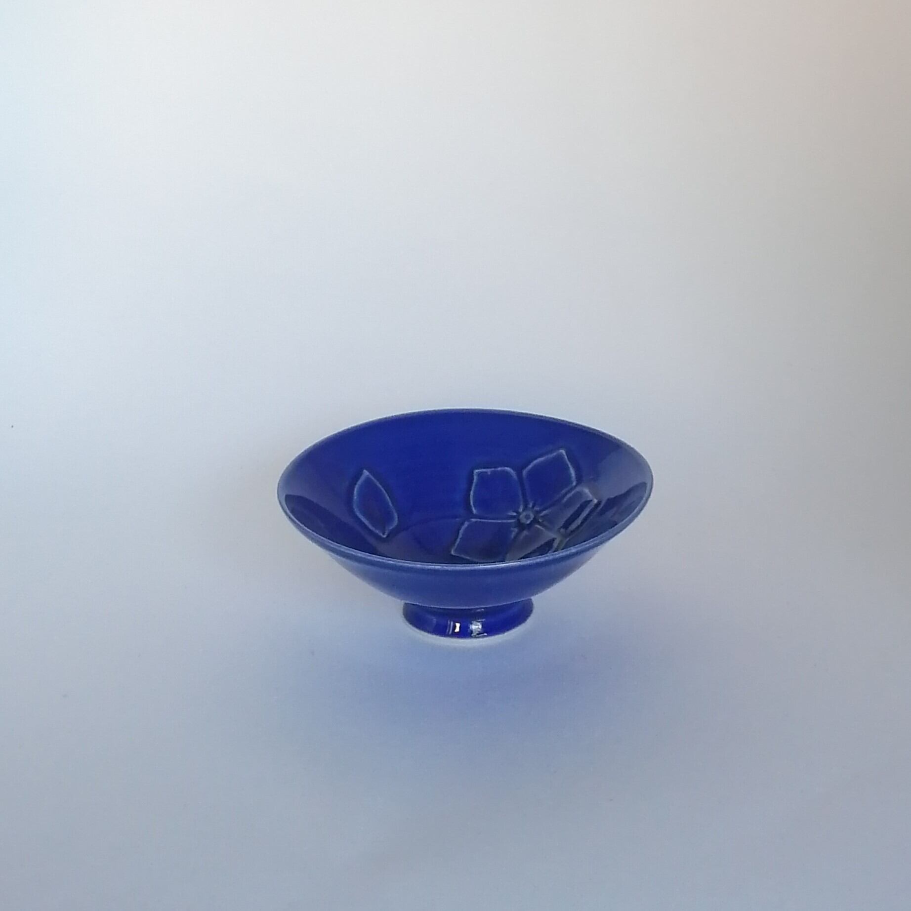 半磁土の素地に、桔梗紋を貼り付け、釉薬を掛けました。