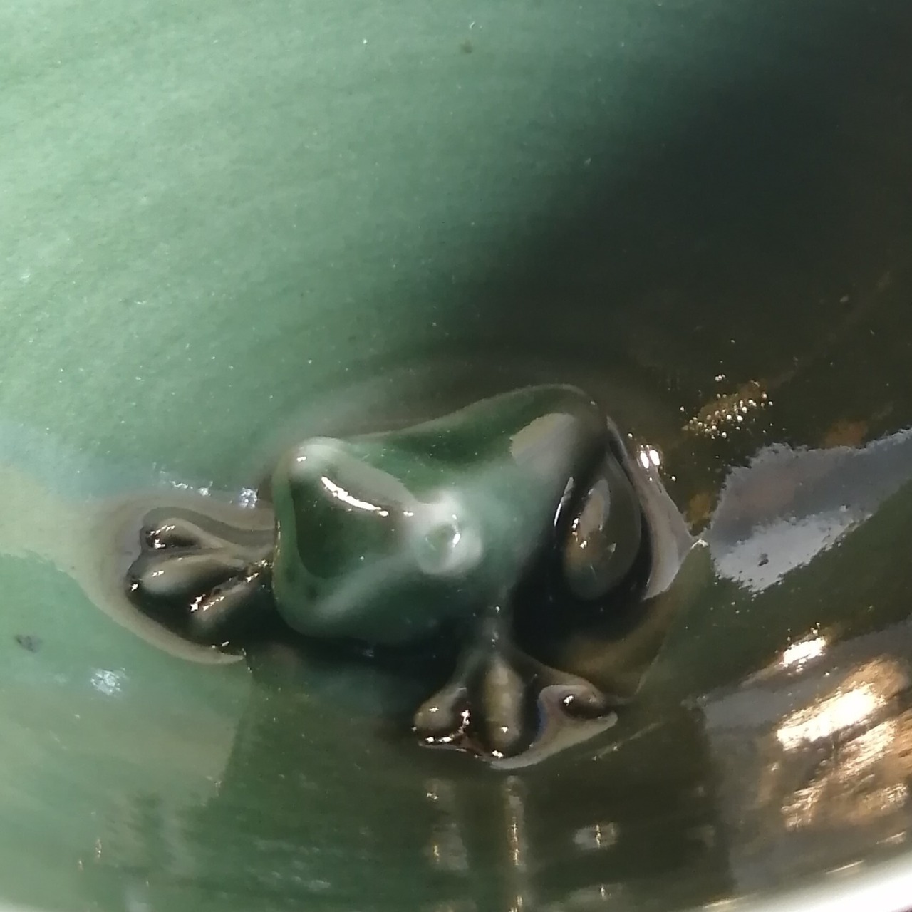 半磁器土の素地に、『蛙』のモチーフを入れ、盃の淵を切りとり『蓮の葉』をイメージしました。釉薬は織部釉を総掛けしています。